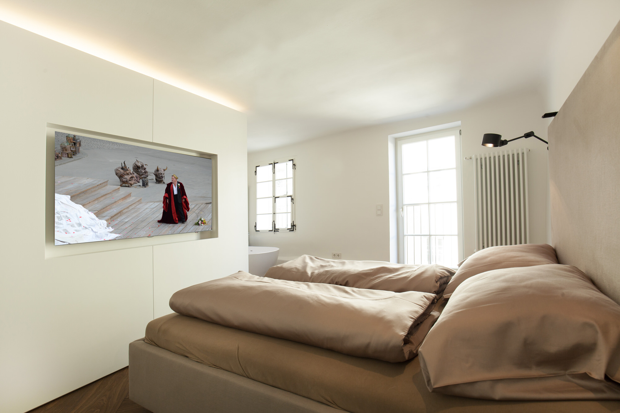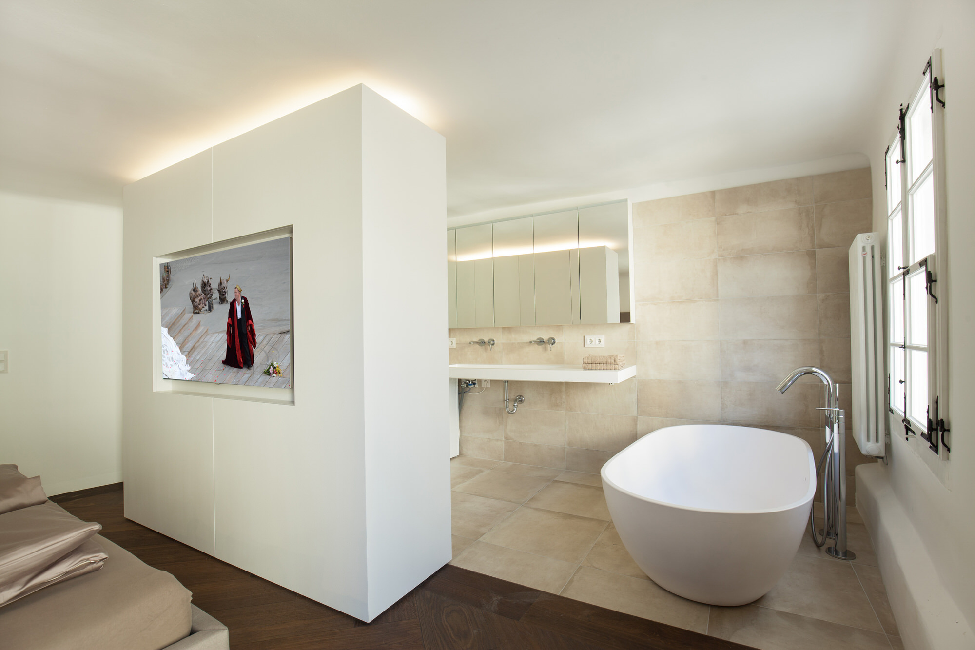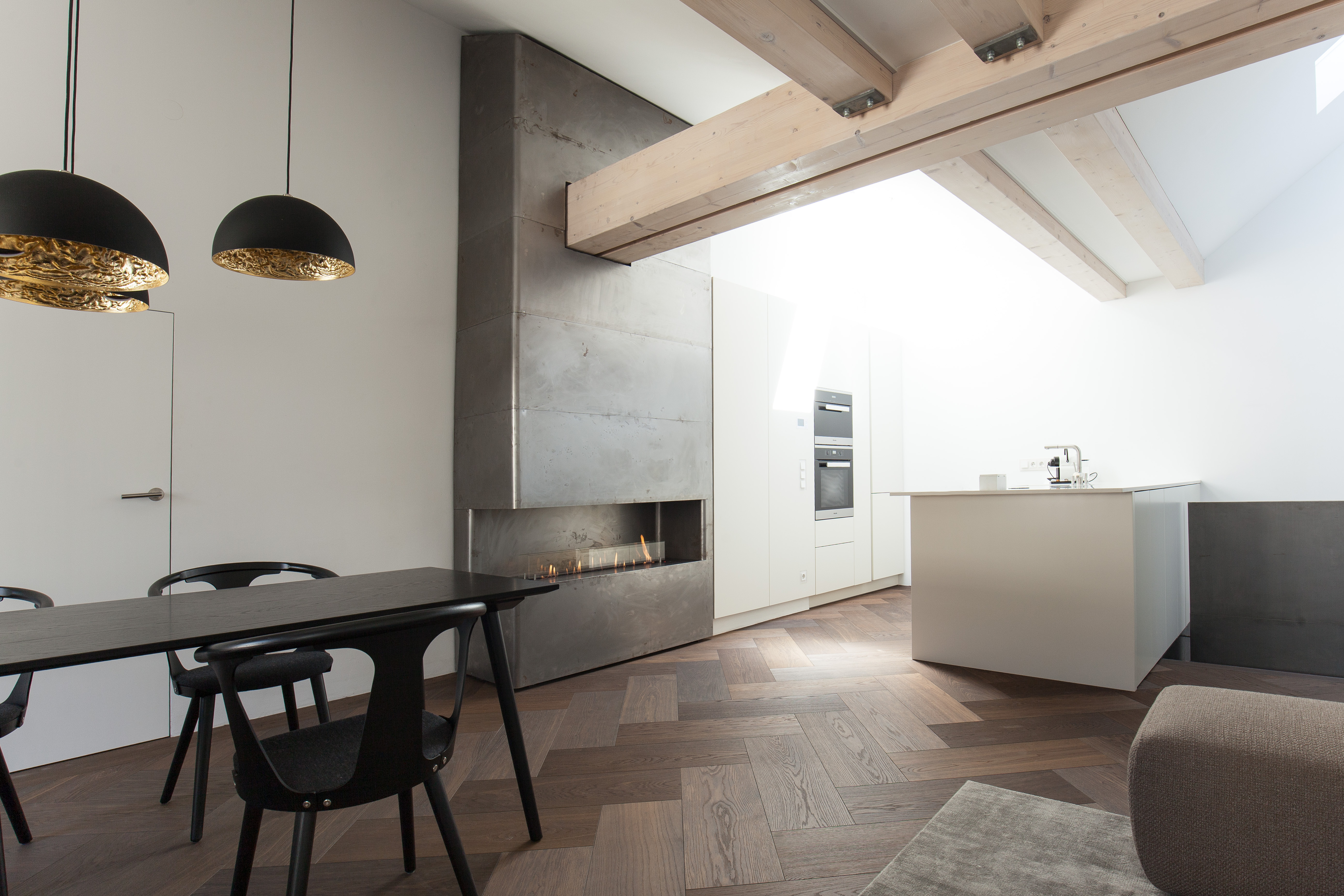 Luftige Wohnbereiche, exklusive Ausstattung, private Dachterrasse, perfekte Kombination aus Alt und Neu. Offener Kamin, Vollholzparkettböden, Mieleküche, denkmalgeschützte Wandmalerei und Holzdecke, hochwertige Armaturen, Räume veränderbar, Personenaufzug, Fußbodenheizung.